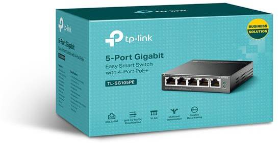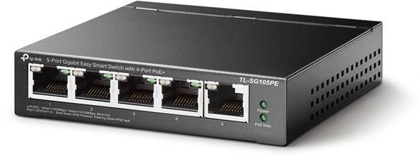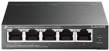 TP-Link - TL-SG105PE - 5-Port Gigabit Easy Smart Switch with 4-Port PoE+PORT: 4× Gigabit PoE+ Ports, 1× Gigabit Non-PoE PortsSPEC: 802.3at/af, 65 W PoE Power, Desktop Steel CaseFEATURE: MTU/Port/Tag-based VLAN, QoS, IGMP Snooping, Web/Utility Management, Plug and Play