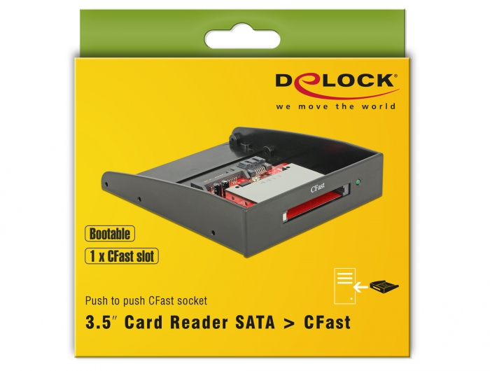 Denna kortläsare kan monteras i en 3.5?-plats på en dator och anslutas till en ledig SATA-port på moderkortet. CFast-kortet fungerar som ett extra minne, samt som en hårddisk för ett operativsystem som även är startbart.