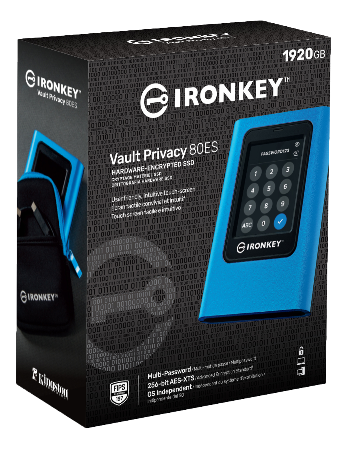 Kingston IronKey™ Vault Privacy 80 External SSD is Kingston’s first innovative OS-independent hardware-encrypted external SSD with touch screen for data protection. VP80ES safeguards against Brute Force attacks and BadUSB with digitally-signed firmware. Brute Force attack protection crypto-erases the drive if the Admin and User passwords are entered incorrectly 15 times1 in a row by default. The drive is FIPS 197 certified with XTS-AES 256-bit encryption using a Common Criteria EAL5+ (CC EAL5+) certified secure microprocessor, and is TAA compliant.