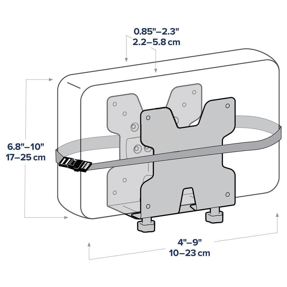 Med denna mångsidiga hållare kan du enkelt integrera en liten dator på arbetsplatsen. Den passar perfekt för tunna klienter, en Wyse-klient, Mac mini eller annan kringutrustning. Den universella designen kan anpassas till dimensionerna på lådan och monteringsgränssnittet fästas på olika ytor: en VESA-platta, direkt på ett bord, med klämmor på en stolpe eller fäst på Ergotron Väggskena.