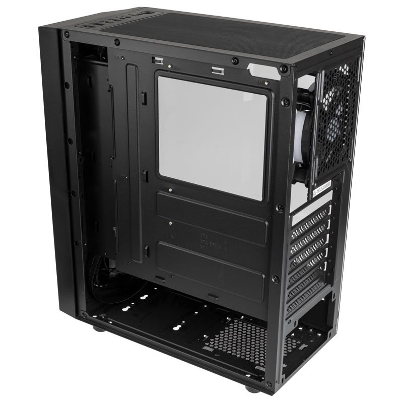 Utöver den förinstallerade fläkten finns även utrymme för tre 120 mm fläktar i fronten, samt två i toppen. Allt toppas med en sidopanel i härdat glas.