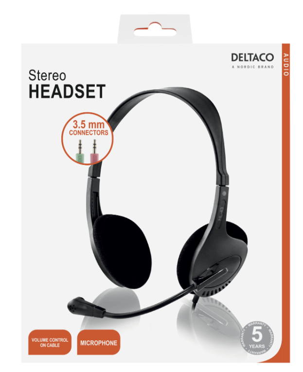 Deltaco HL-43 Headset, 3,5mm, volymkontroll på kabeln