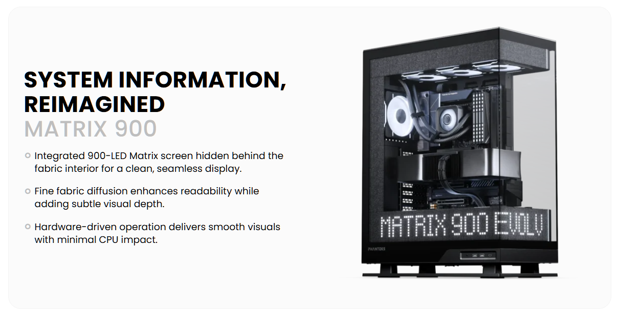 The Evolv X2 Matrix introduces a bold new dimension to the Evolv series with its integrated 900-LED Matrix Display, hidden behind the refined fabric interior. This unique feature transforms the chassis into a dynamic canvas, bringing personalized lighting and visual effects directly into your build.