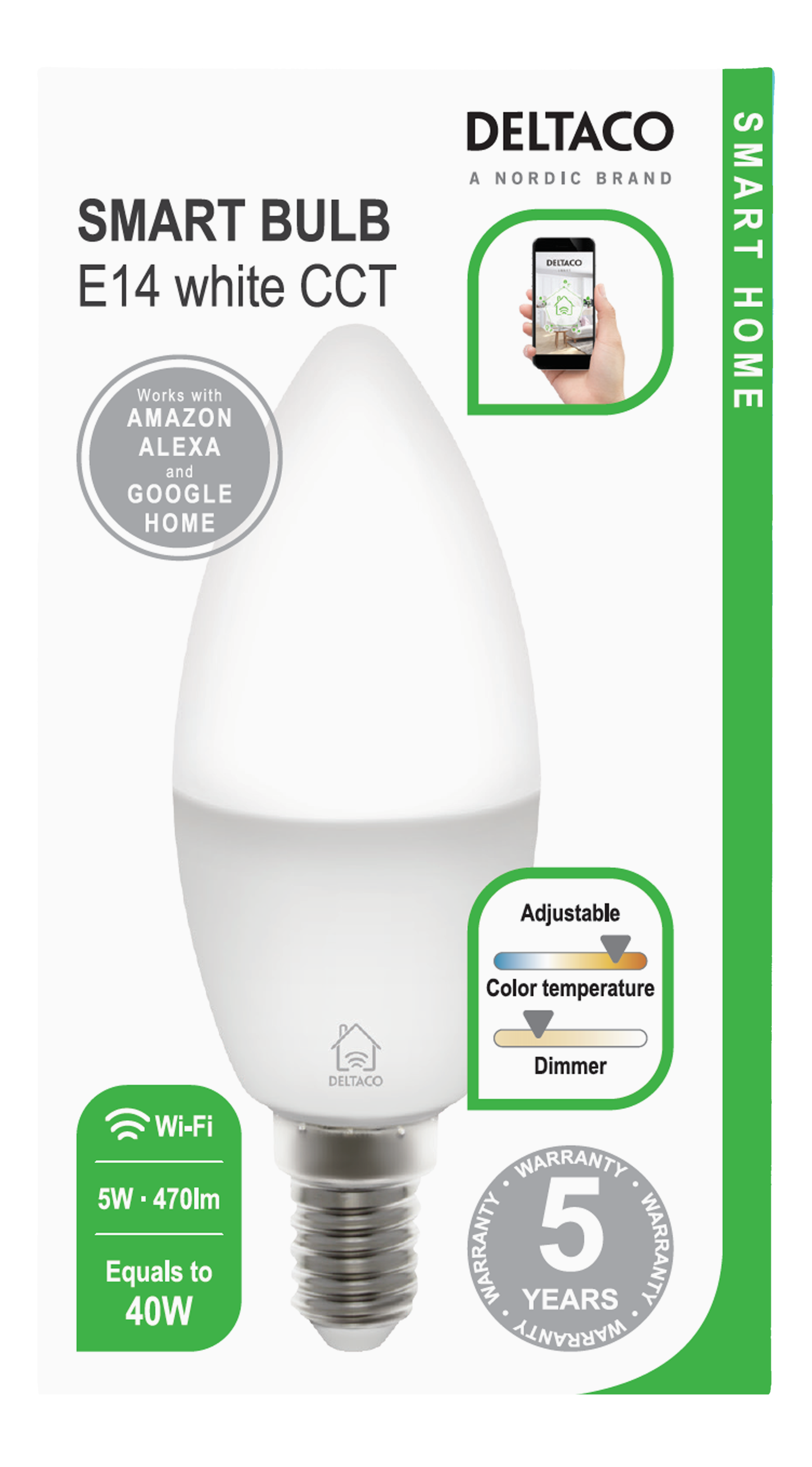 DELTACO SMART HOME LED-lampa, E14, WiFI 2,4GHz, 5W, 470lm, dimbar, 2700K-6500K, 220-240V, vit