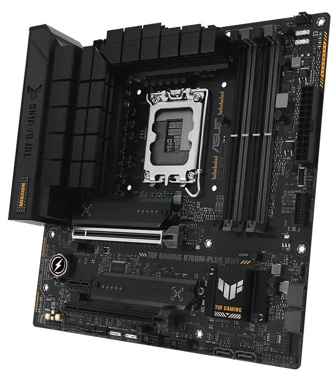 Asus TUF GAMING B760M-PLUS WIFI, Intel LGA1700, 2xPCI Express, MicroATX, 4xDDR5, 2xM.2 + SATA3 RAID, HDMI/DP, USB-C, 2.5Gbe LAN, WiFi 6, Bluetooth 5.2, Aura Sync RGB