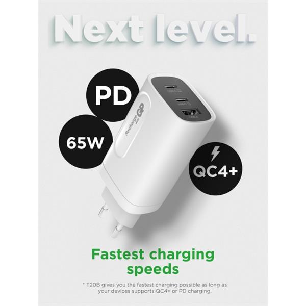 GP Batteries GaN Wall Charger USB-C PD 65W, 2xUSB-C+1xUSB-A