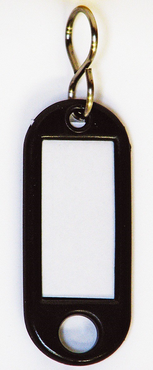 Nyckelbricka i plast med etiketthållare. Försedd med fönster och etikett och S-krok. Bricka: 54x21mm, etikett: 32x14mm. 100st/fpSvart