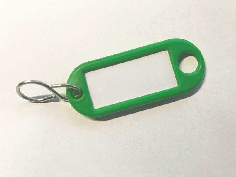 Nyckelbricka i plast med etiketthållare. Försedd med fönster och etikett och S-krok. Bricka: 54x21mm, etikett: 32x14mm. 100st/fpGrön
